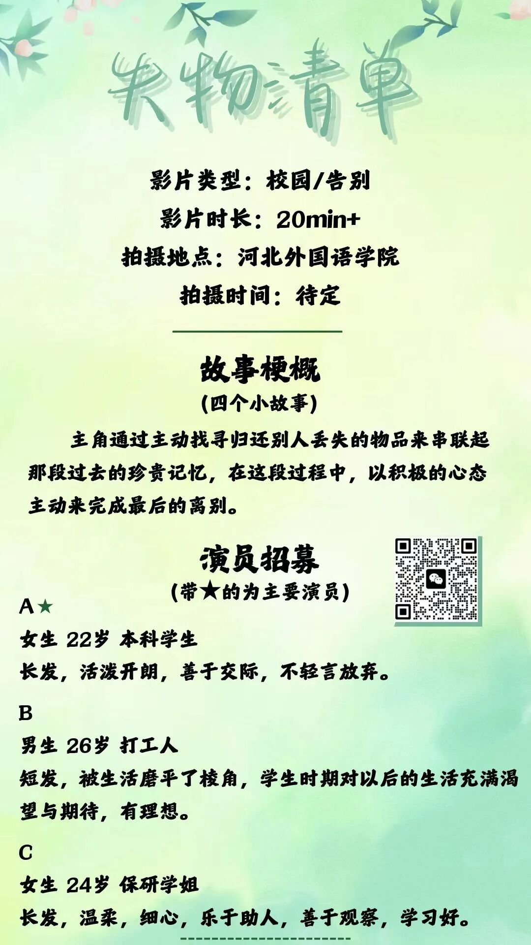 在河北外国语学院的校园里,一段关于“失物”与“告别”的故事即将上演。我们正在招募热爱表演、渴望在镜头前展现自我的你,共同完成这部时长20分钟+的校园告别短片《失物清单》。